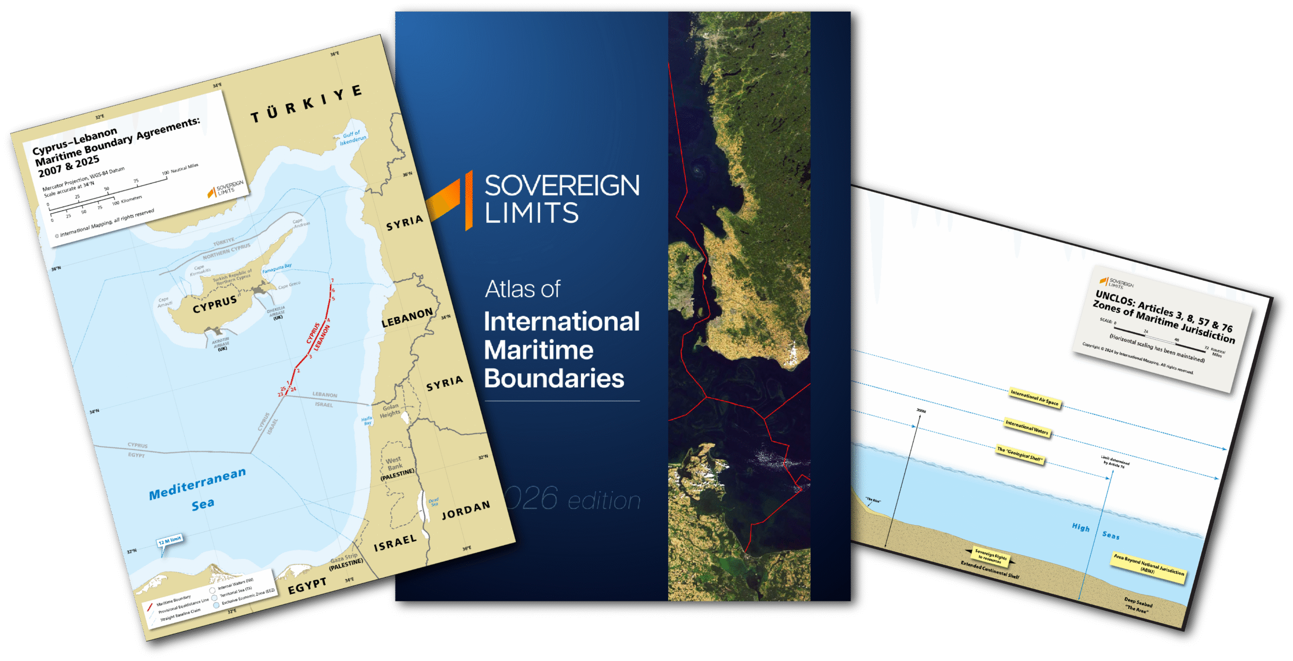 For nearly a decade, cartographers and boundary analysts at International Mapping have been carefully crafting a collection of maritime boundary maps of every established boundary in the world. These maps have been assembled into Sovereign Limits’ Atlas of International Maritime Boundaries: 2026 Edition. The digital Atlas features more than 245 full-color maritime boundary maps, organized into sixteen maritime regions that cover every major maritime area of the world. The Atlas also includes a section on “UNCLOS Illustrated”—a series that visualizes maritime boundary delimitation and zones of entitlement based on the 1982 United Nations Convention on the Law of the Sea. Additionally, the “World Reference Maps” section provides global background information on oceans, marine industry and others.